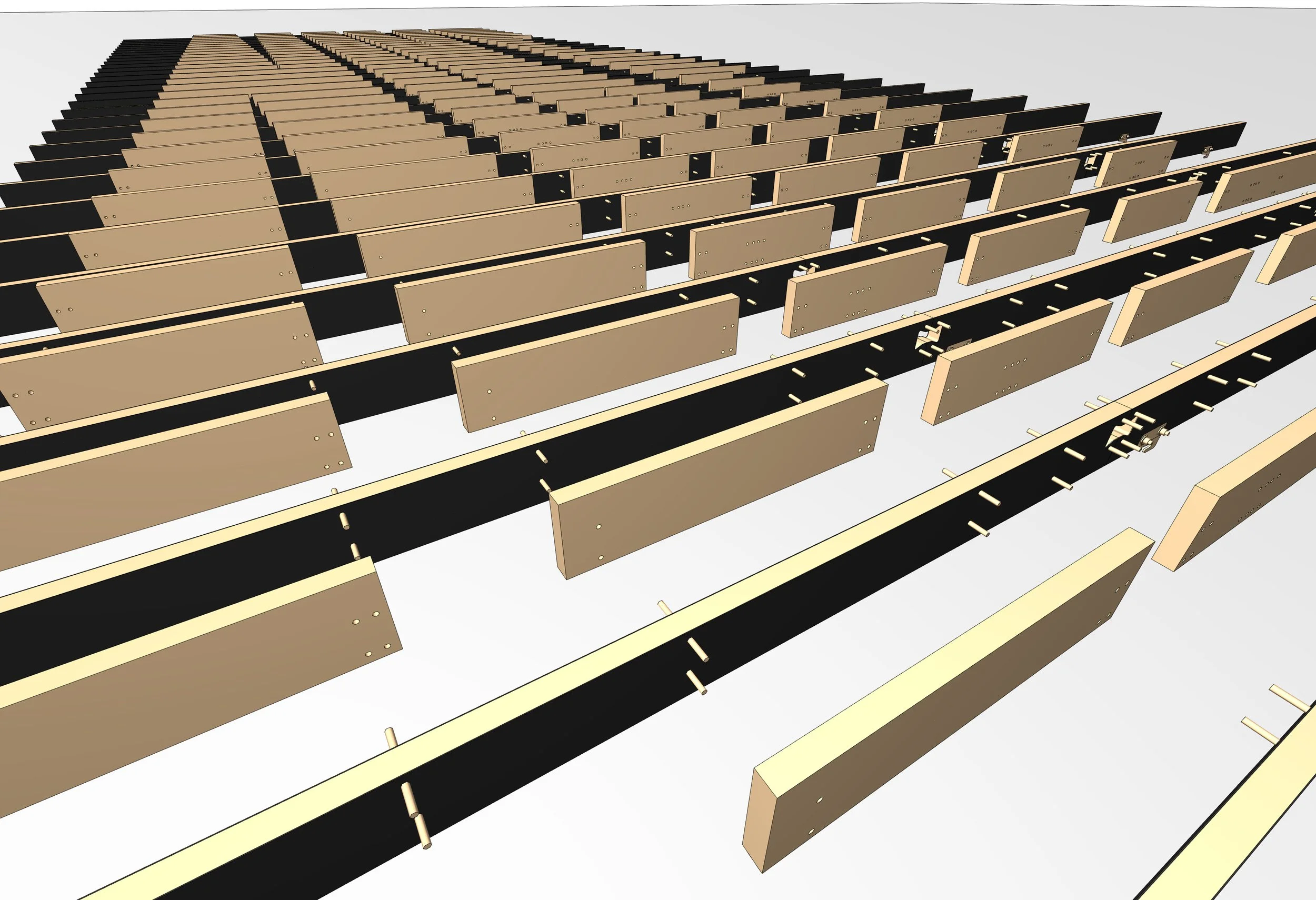 312 unique pieces of 32mm thick plywood are needed to complete the scheme. Each piece has its unique set of perforations, to assemble background and foreground planks. All pieces are sent to CNC machinery with their number engraved in their surface for easy assembly. Here below the detail drawing showing a small part of the total pieces.